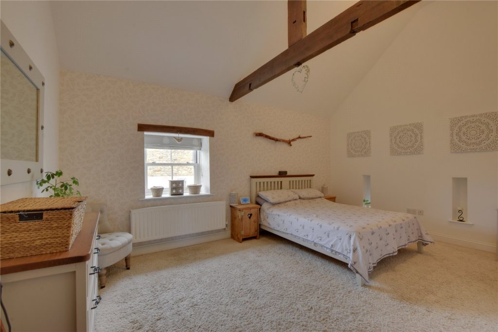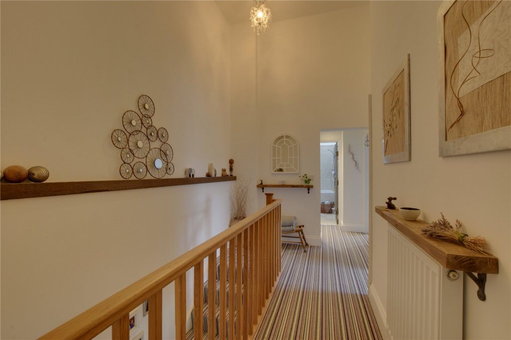 The first floor accommodation is accessed via the stairway in the dining room, which leads to the spacious landing with high-vaulted ceilings. There is also a large storage cupboard with shelving.