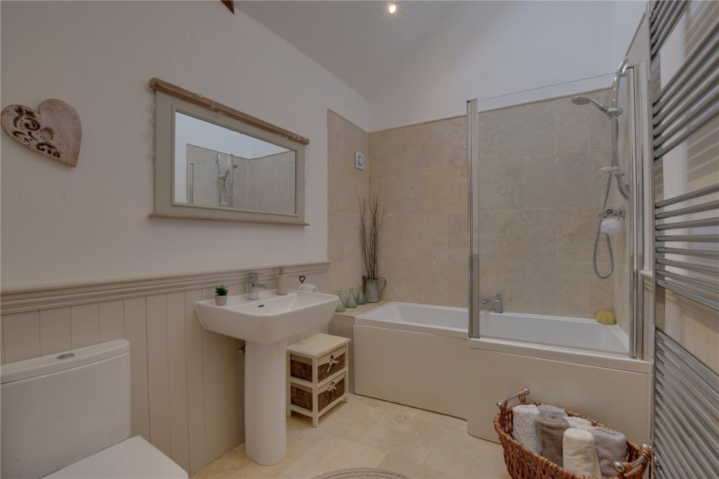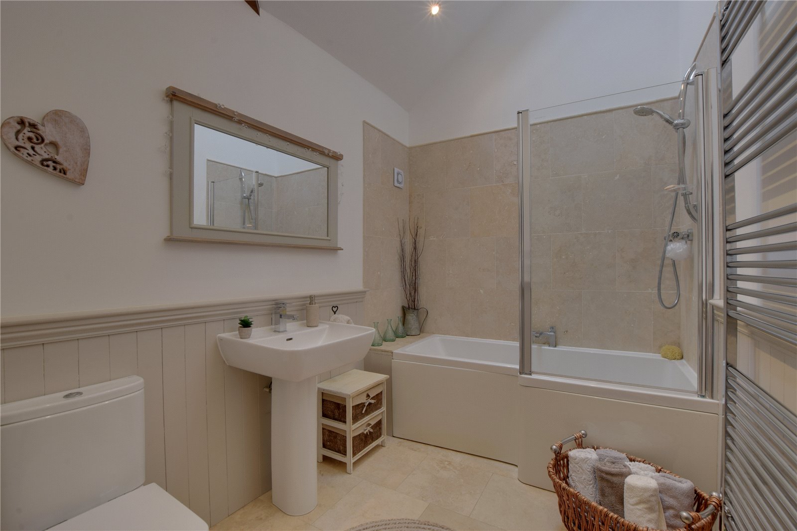 The family bathroom completes the first floor accommodation and is fitted with a modern, white suite to include a P-shaped bath with an overhead, mains fed shower and shower screen, a pedestal wash hand basin and a low level WC. There is also a high vaulted ceiling with chrome inset spotlights and a Velux window, tiled flooring and a chrome heated towel rail.