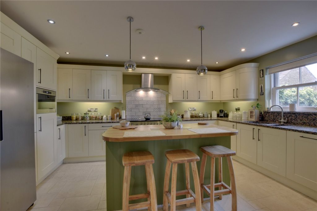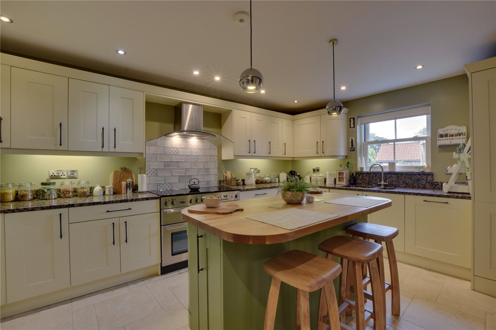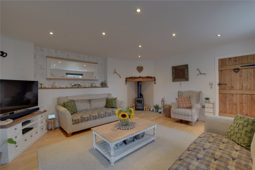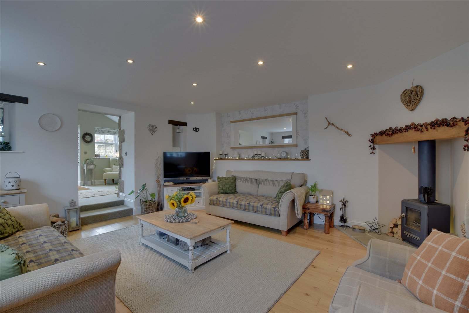 Steps lead down from the snug into the spacious living room which benefits from two windows to the front aspect, providing plentiful natural light. The focal point to this room is the Chesney's wood burning stove, which is set upon a flagged hearth with a timber mantle over. There are also chrome inset spotlights to the ceiling.