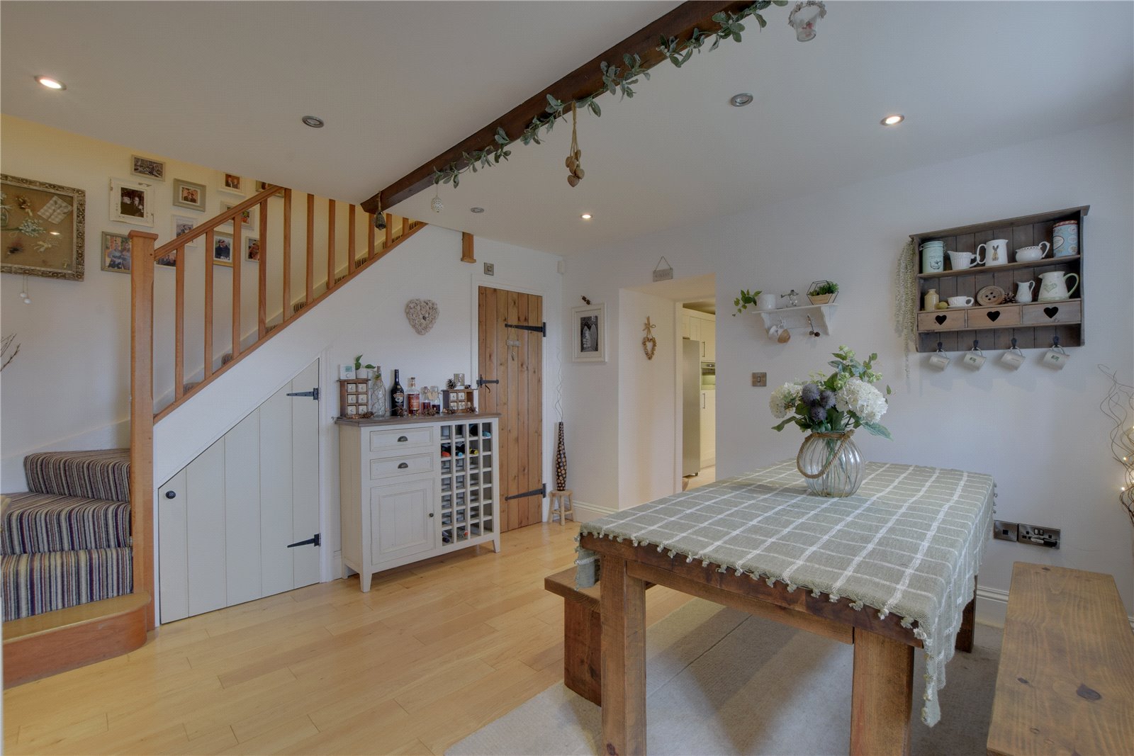 The bright and airy dining room is accessed from the living room via an oak ledge and brace door. There is a beamed ceiling with chrome inset spotlights, a window to the front aspect and a secondary entrance door leading to the gardens, as well as the stairway leading to first floor accommodation with useful under stair storage.