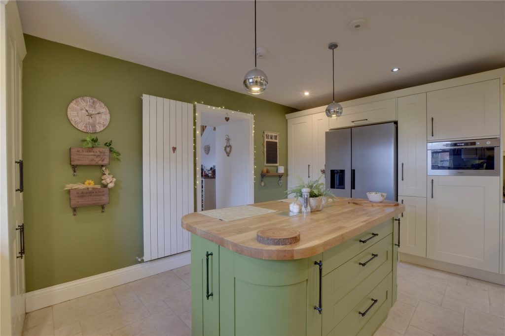 Leading from the dining room is the superb kitchen which boasts a central island with a breakfast bar, ideal for informal dining. Fitted with a range of two tone wall and base units topped with granite work surfaces which incorporate a sink. Integrated appliances include a Toledo Rangemaster electric cooker with an extractor fan over, a washing machine, a dishwasher, and a microwave, and a freestanding American style fridge/freezer which is included in the sale. Contemporary chrome pendant lights are positioned over the island which complement the inset spotlights to the ceiling. Stone effect tiled flooring completes the room, adding to the rustic charm. There is also a window to the side and a larder style cupboard housing the boiler which was installed in 2024, as well as a wall-mounted, vertical radiator.