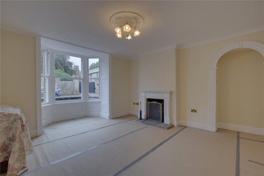 The main entrance leads into the spacious reception hallway, where to the left hand side lies the living room. Flooded with natural light courtesy of the large bay window to the front elevation, an open grate fireplace with a wooden surround provides a focal point.