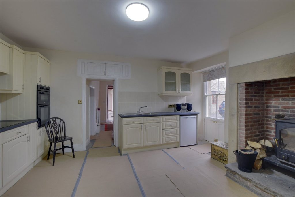 The kitchen is located to the rear, and is fitted with a range of base and wall mounted storage units, topped with contrasting worktops which incorporate a stainless steel sink. There is also an inglenook with exposed brickwork housing a multi-fuel stove.