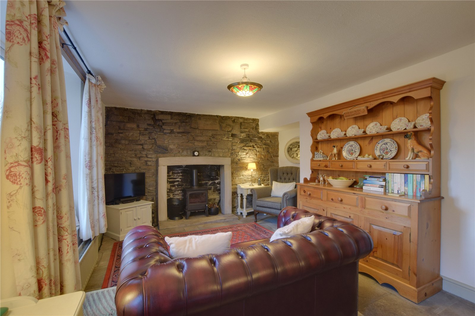 The main entrance leads into the living room, which features traditional flagged stone floors that continue throughout the ground floor accommodation. The focal point to the room is the impressive inglenook housing a multi-fuel stove, while an exposed stone wall contributes to the character of the property.