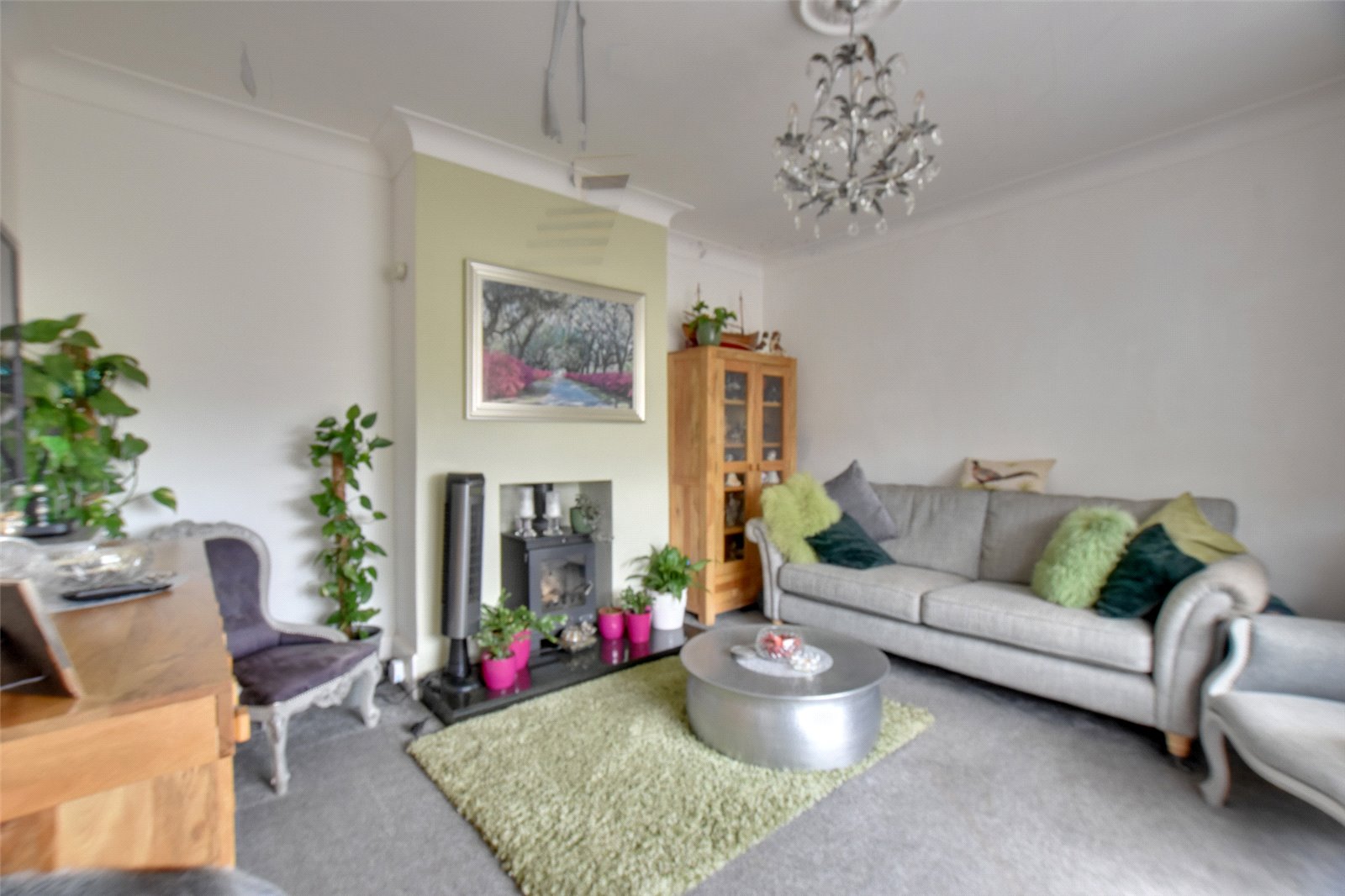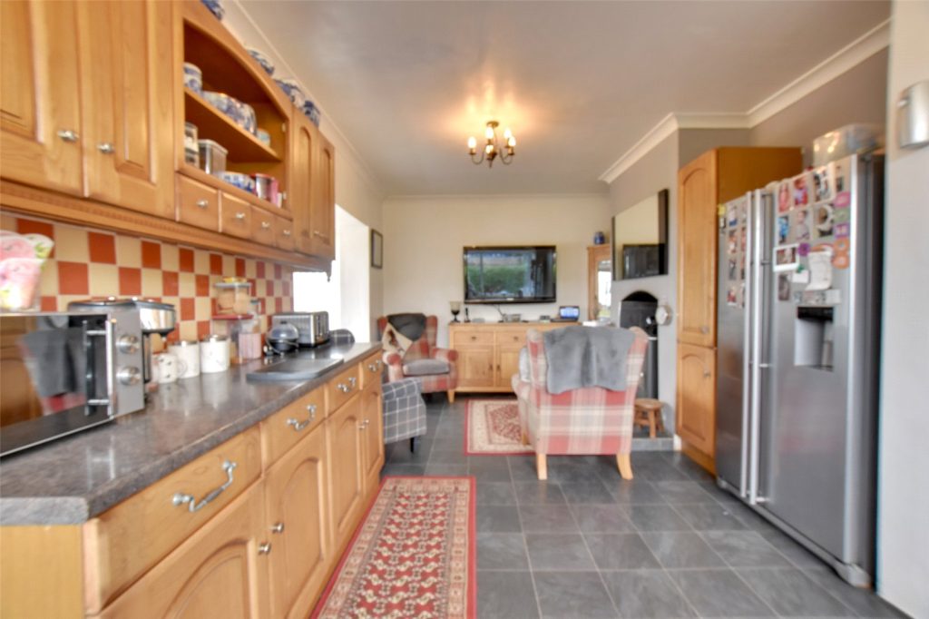 To the rear of the property, there is an open plan kitchen and dining room, which is fitted with a good range of wall and base mounted storage units, which are topped with a contrasting laminated working surfaces, which incorporates a sink and drainer unit. The walls are tiled to splash back areas, while the floor is also tiled. There is an integral oven and hob, alongside space for appliances. The kitchen area extends to a dining area, which offers ample space for a table and chairs in the rear walk in bay window, enjoying views towards the coast, and also having space for a snug area or seating by the multifuel burning stove.