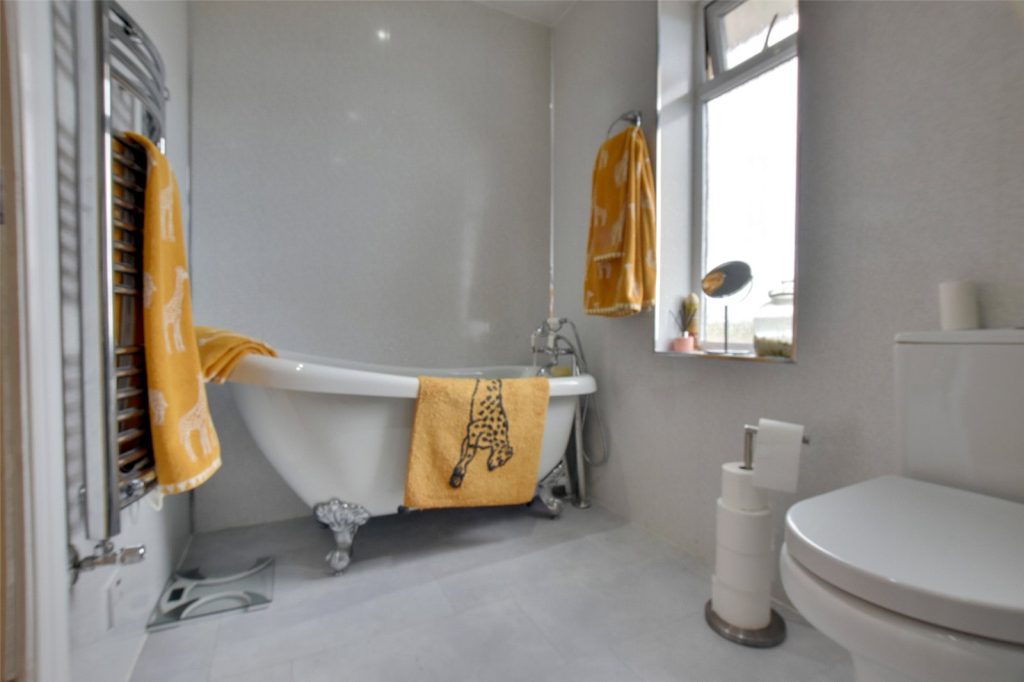The house bathroom completes the accommodation, boasting a white suite with shower cubicle, claw foot freestanding bath, vanity wash hand basin and WC. The bathroom is fully clad to the walls and offers a neutral linoleum to the floor, while light is provided via spotlights to the ceiling and a rear facing opaque window.