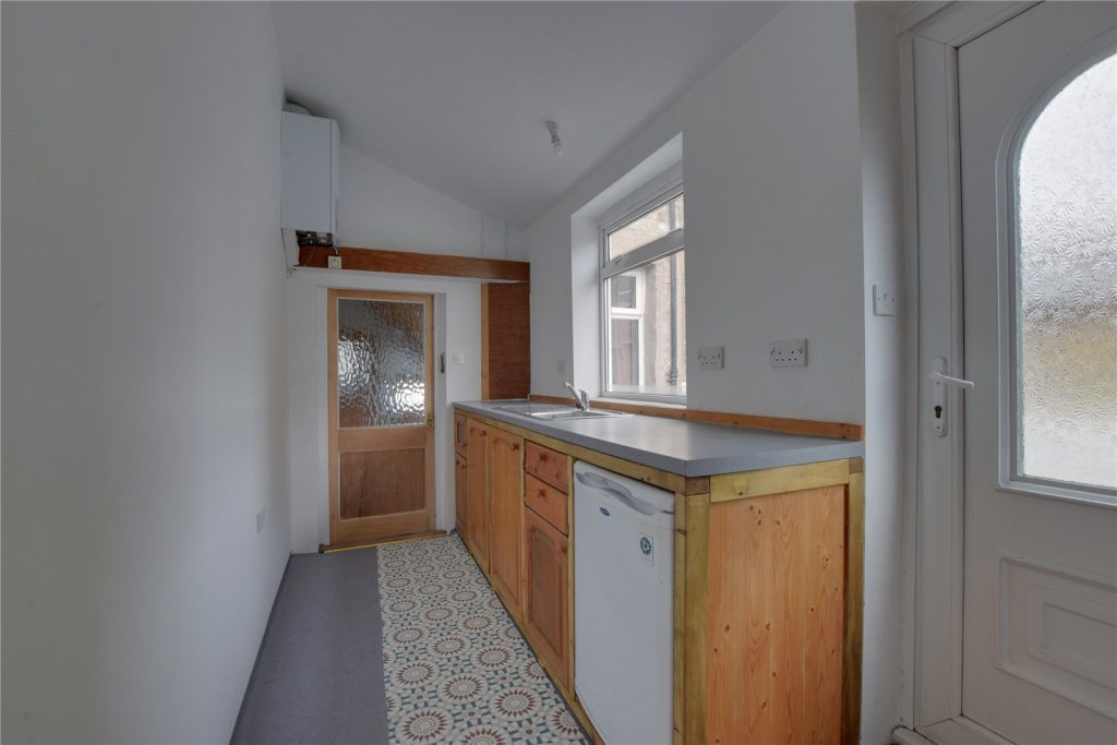 The kitchen is located to the rear of the property and is fitted with a range of base mounted storage units, topped with contrasting worktops which incorporate a stainless steel sink.