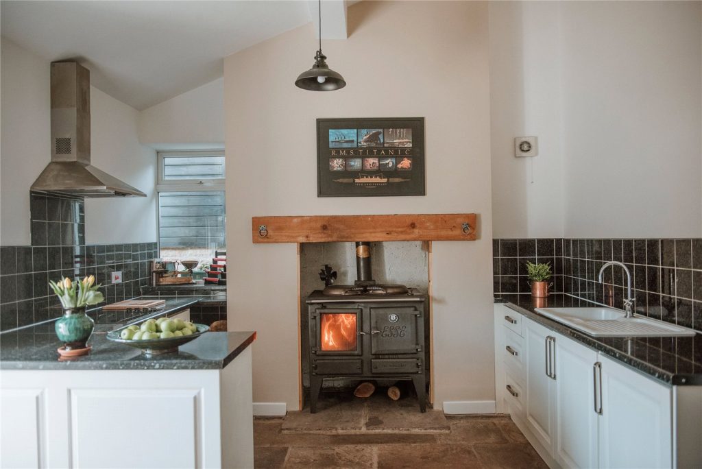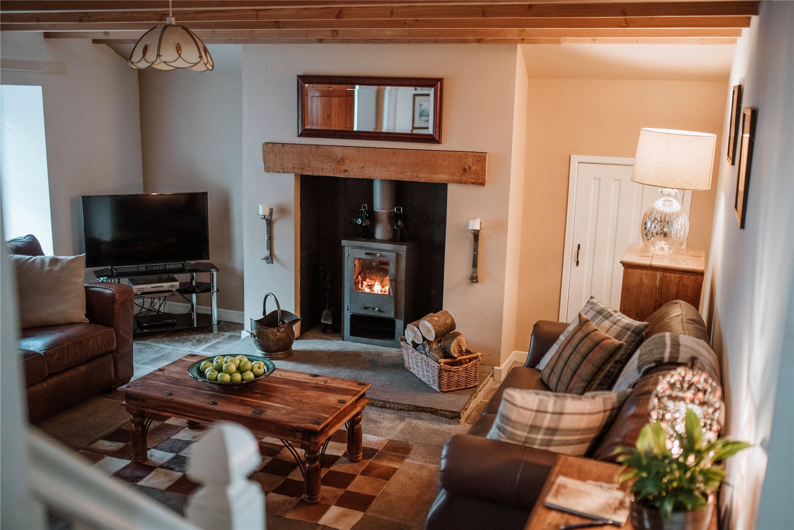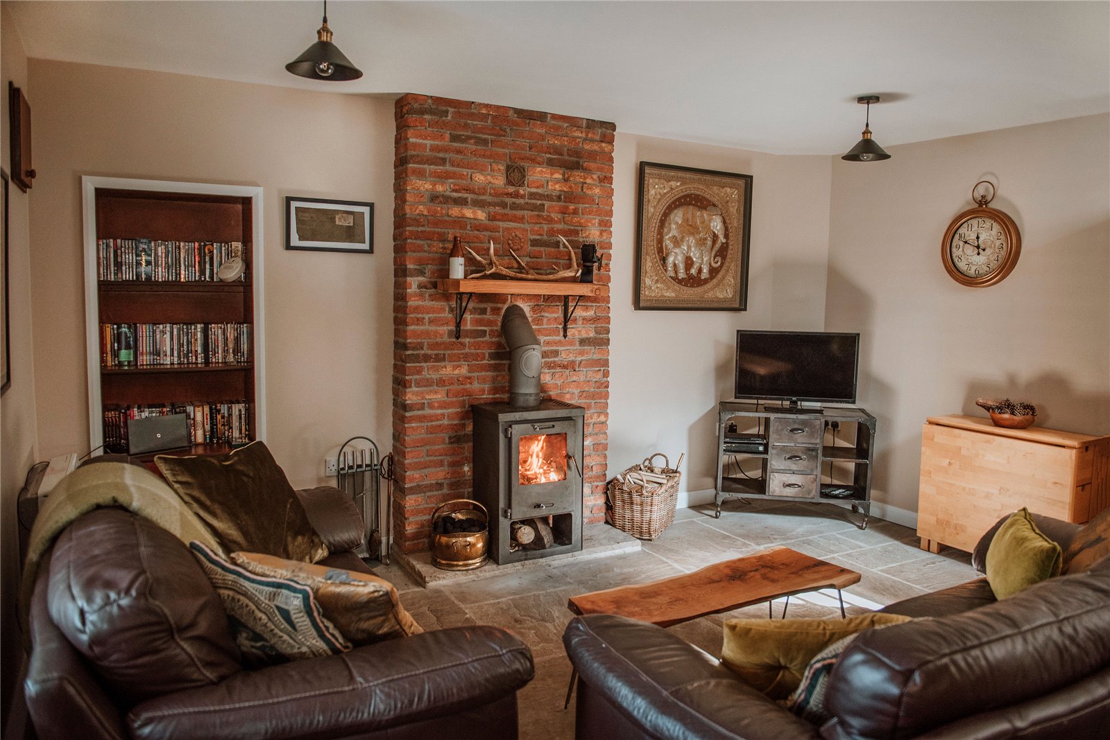 The living area leads off the reception hallway, which features traditional stone flooring throughout. There is a kitchen area which is fitted with a range of base mounted storage units, topped with contrasting worktops which incorporate a stainless steel sink unit. There is space for a freestanding electric cooker, while there is space for further, slimline appliances within the under stair space, conveniently stored behind cupboard doors. There is also a brick detailed chimney breast which offers an impressive multi-fuel stove as the focal point.