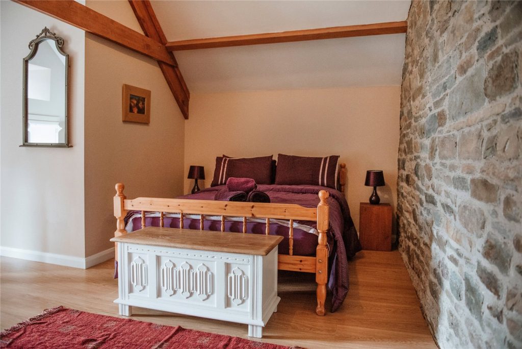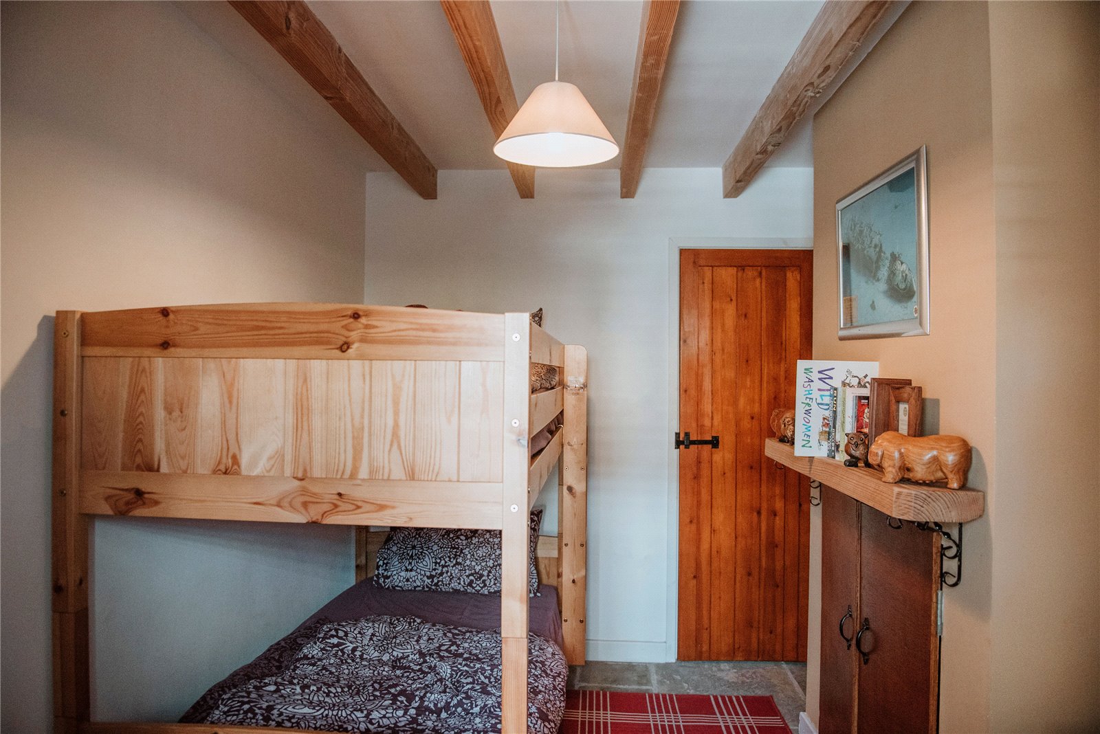 Returning to the entrance, to the right hand side lies the third bedroom, which is currently dressed with bunk beds to facilitate the holiday letting business. The bedroom has a stone flagged floor, beams to the ceiling, and a fire place which is currently blocked. From here, there is a door which leads to Gatecroft Barn, which would allow any interested party to make the properties into one, if required, and reinstate the entry point.