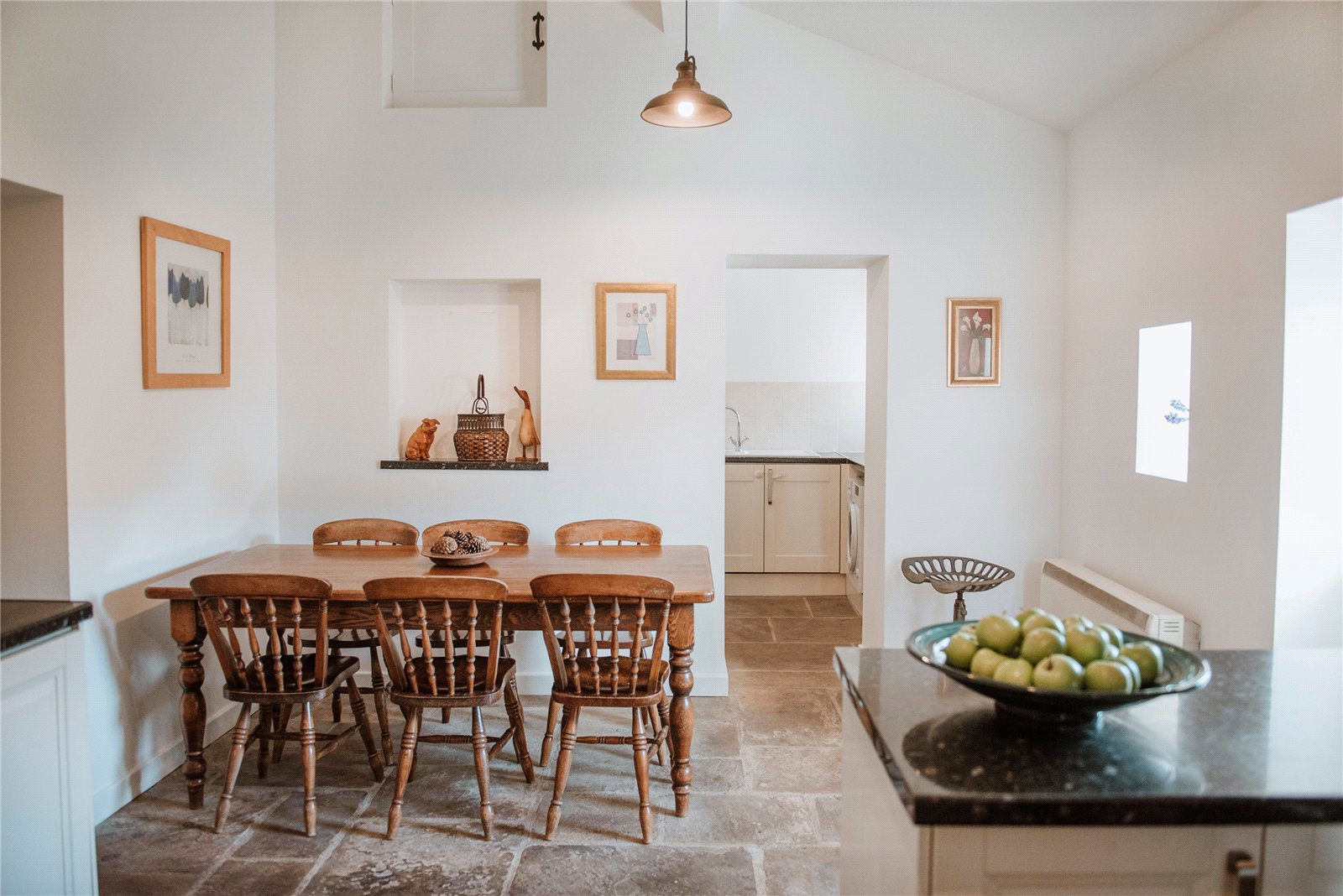 There is a small utility room to the side of the dining area, which houses further base units, again with contrasting working surfaces and a second porcelain sink and drainer unit. There is also space for an under counter washing machine and a built in dishwasher.