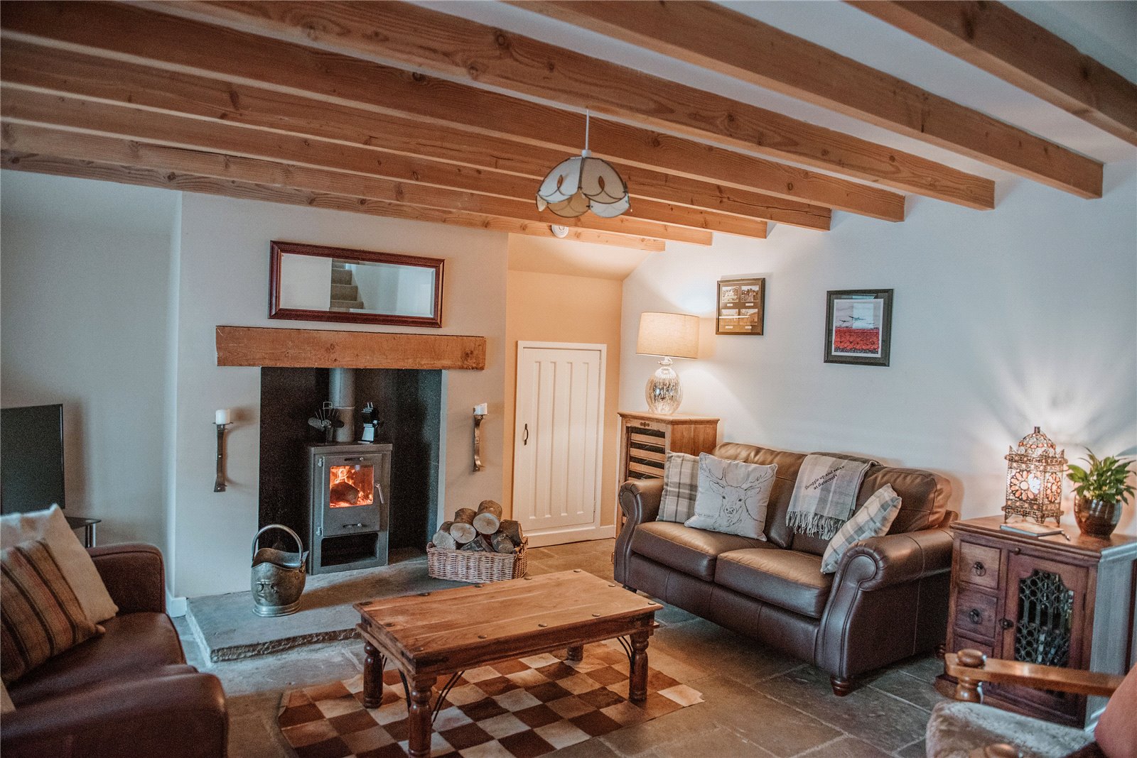 From here lies the spacious living room, which enjoys a pleasant outlook over the front garden. Having stone flagged flooring and beams to the ceiling, the focal point of the room is the multi-fuel stove, which is recessed within an inglenook with a wooden mantel over and a wide stone hearth.