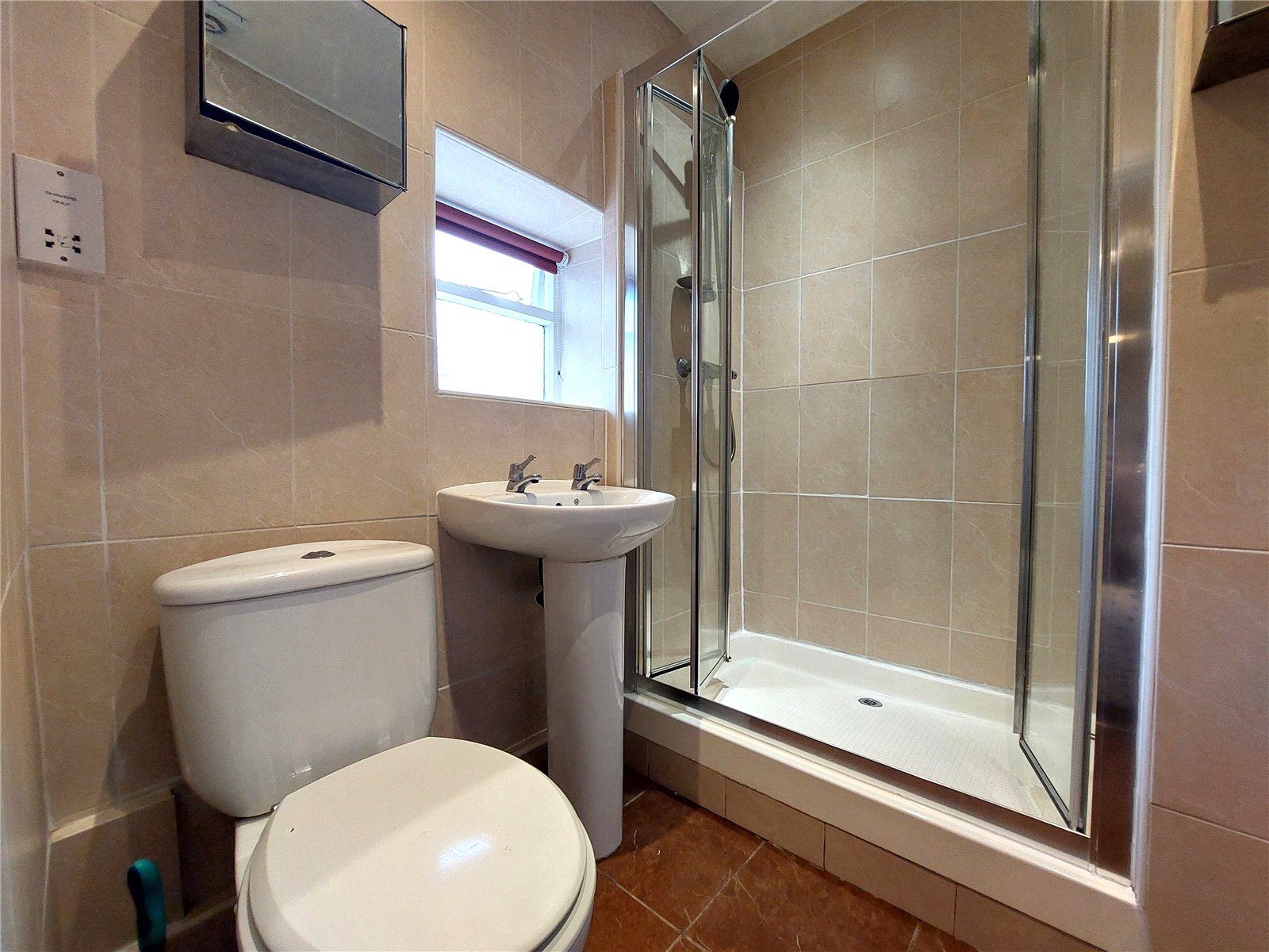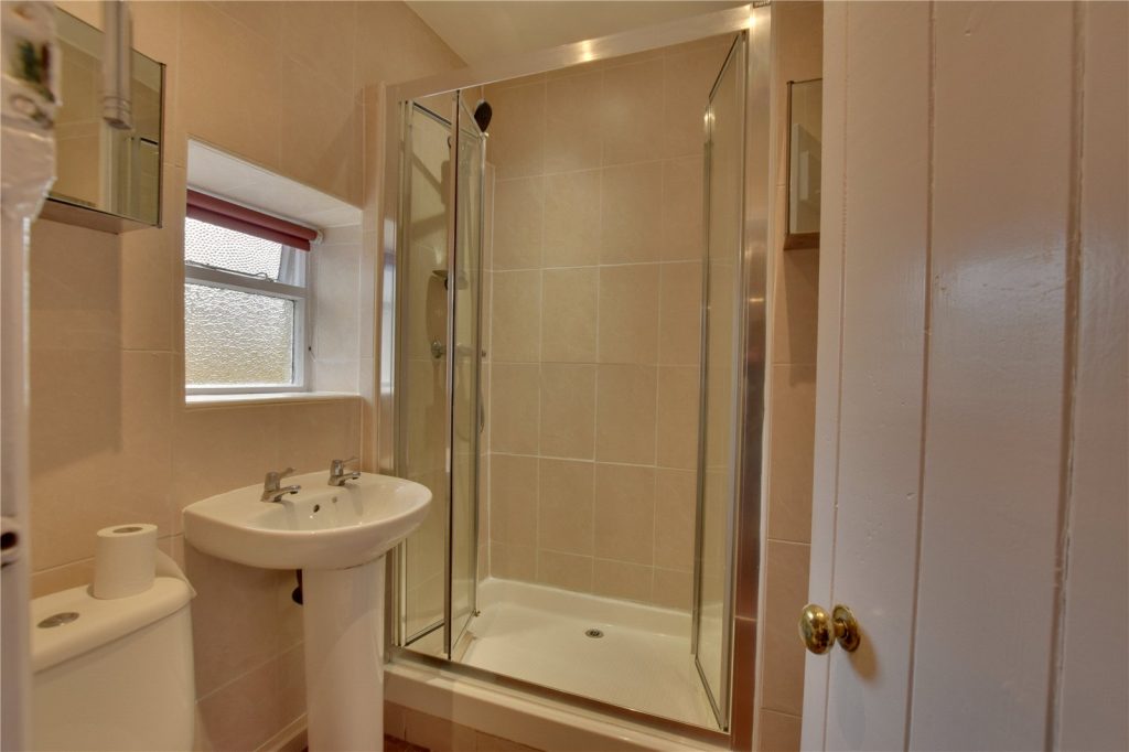 The shower room is fitted with a white suite comprising a WC, a wash hand basin and a shower cubicle with an electric shower.