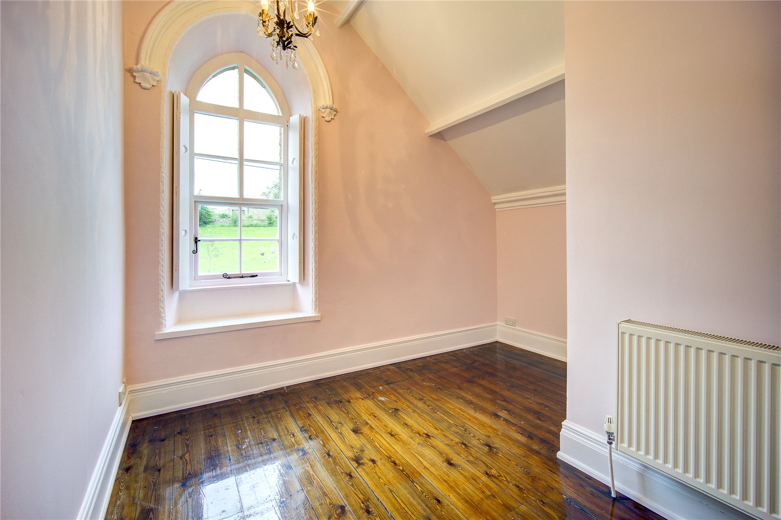 Returning to the living room, stairs rise to the first floor landing. To the front of the property lies the spacious master bedroom, featuring traditional arched windows and fitted wardrobes featuring the original chapel doors. Serviced by en-suite facilities which comprise a low level WC, a wash hand basin set upon a pedestal and a shower cubicle with a mains fed shower.
