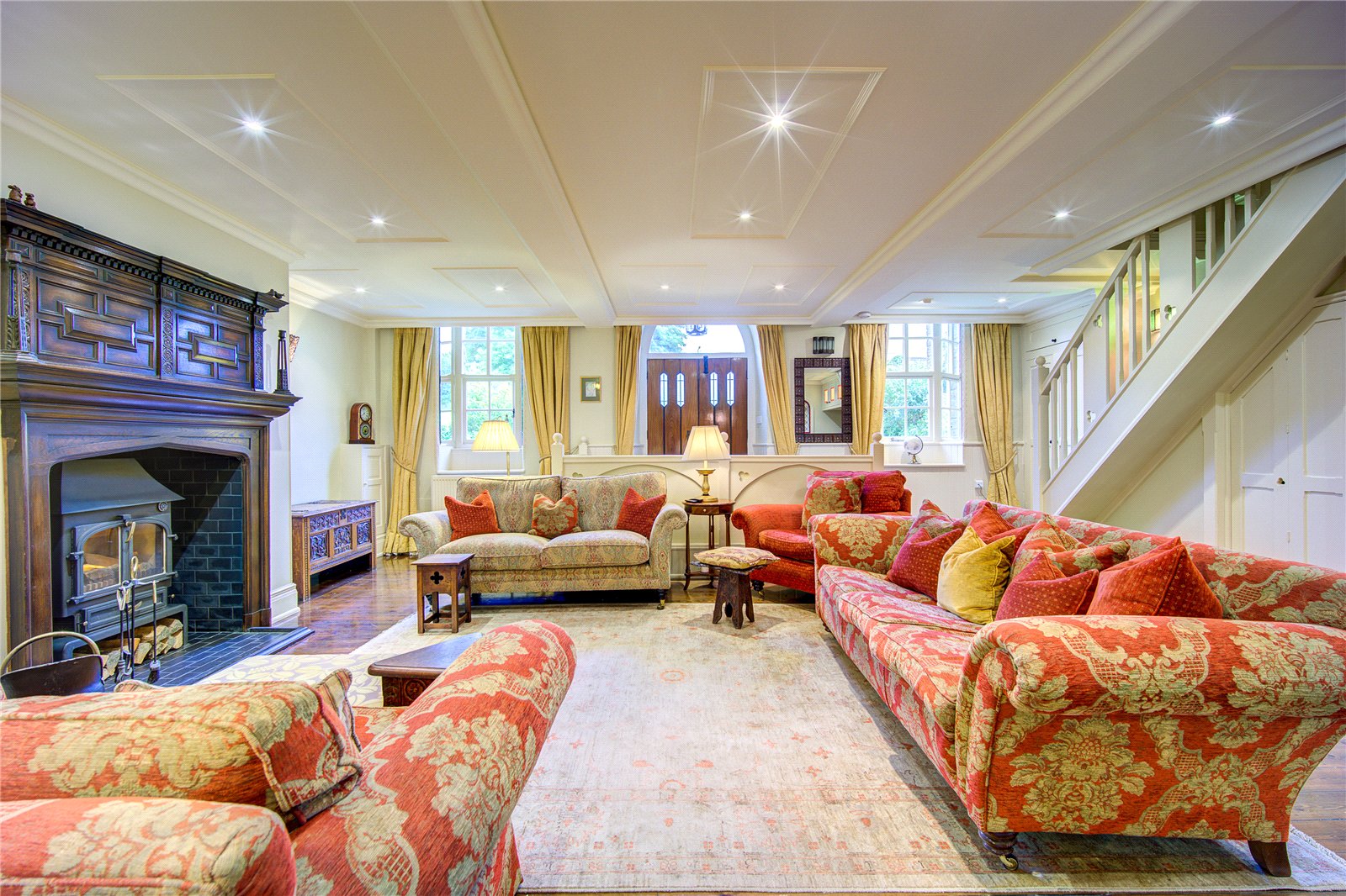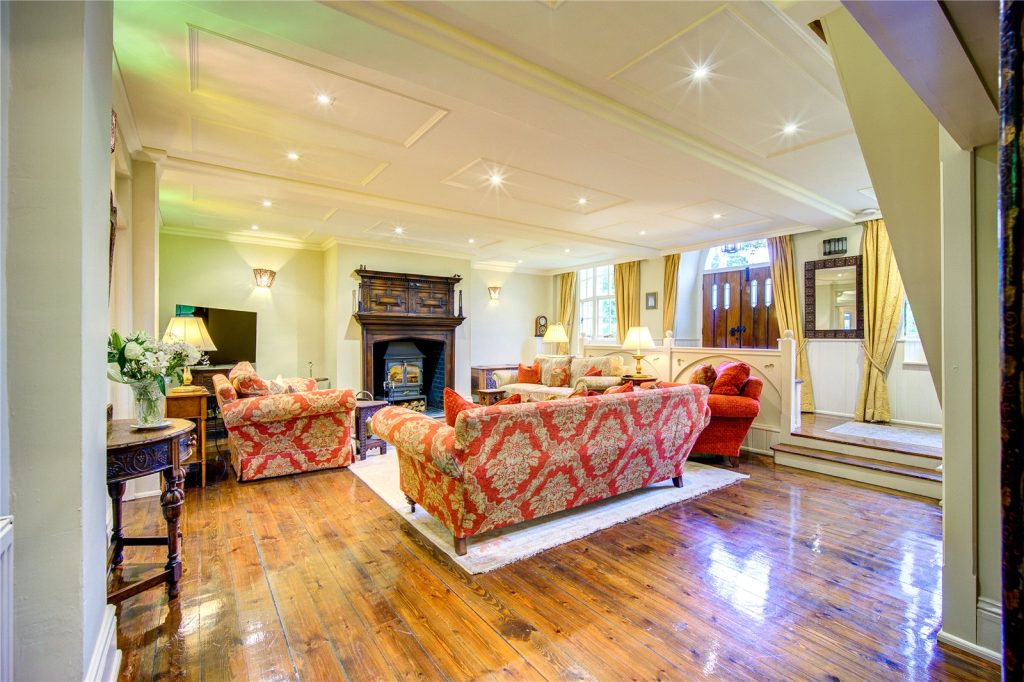 The main entrance leads into the impressive living area, which features a large inglenook housing a multi-fuel stove within a traditional, ornate wooden surround. Exposed, polished wooden flooring and panelled ceilings contribute to the character of the building, while a discreet storage area under the staircase provides space to create a small workspace.