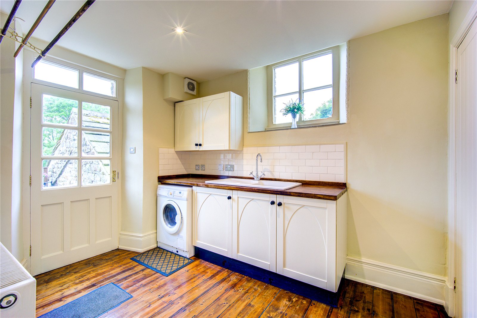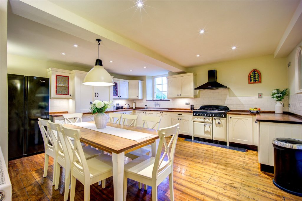 To the rear lies the spacious kitchen/dining room. Fitted with a range of bespoke base and wall mounted storage units, with arched detailing complementing the design of the building, which are topped with solid wood worktops which incorporate a porcelain sink. Integral appliances include a dishwasher, while there is space for an American style fridge/freezer and a range cooker. There is a connection point for LPG to power the cooker.