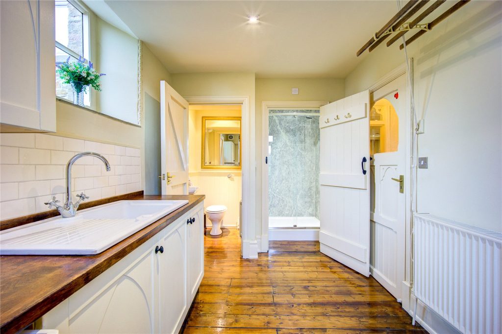 The kitchen is serviced by a useful utility room, which features a matching set of base and wall mounted storage units. There is space, power and plumbing for a washing machine, as well as access to a ground floor WC and separate shower room. The raised decked area can also be accessed from here.