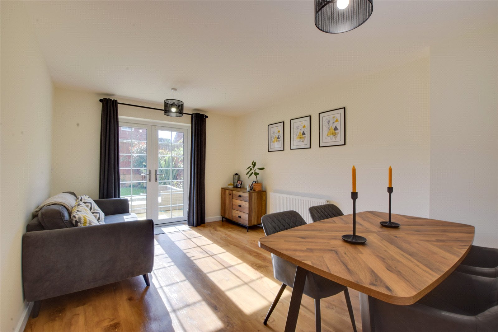 The dining area provides ample room for a second living space or entertaining, with patio doors opening directly onto the rear garden.