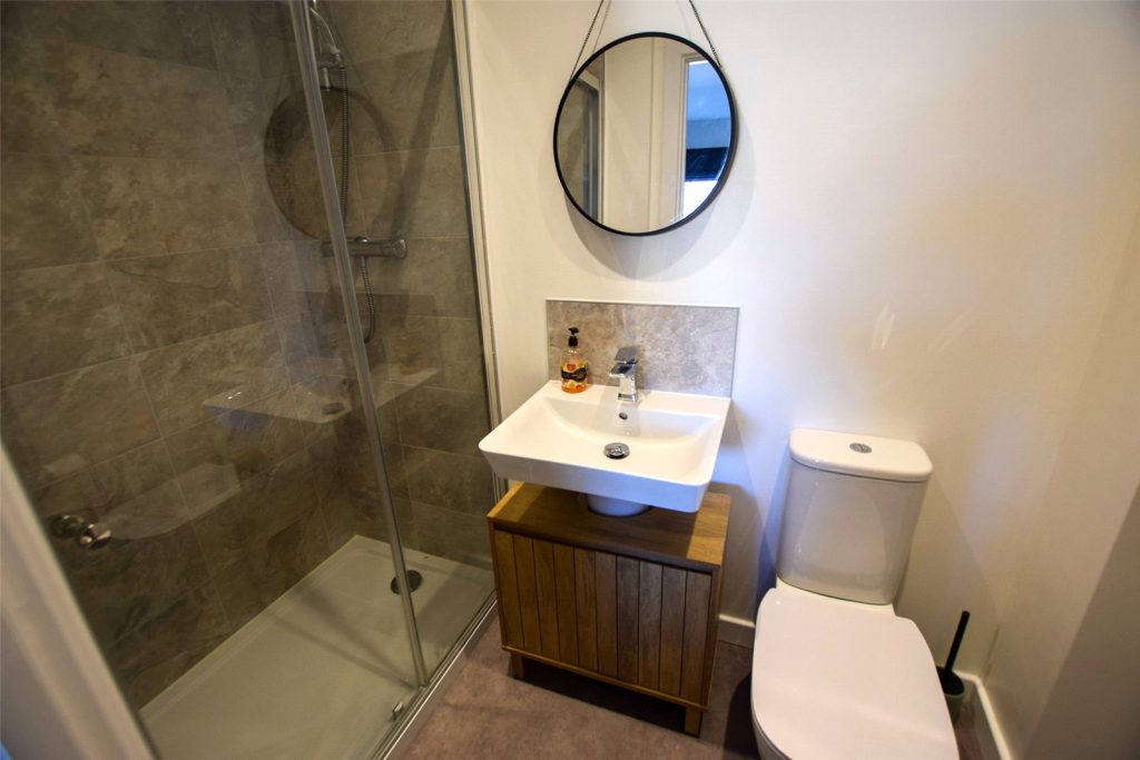 The master bedroom is positioned to the front elevation and features fitted wardrobes along with an en-suite shower room, complete with a shower cubicle, pedestal wash hand basin, low-level WC, and a chrome heated towel rail.