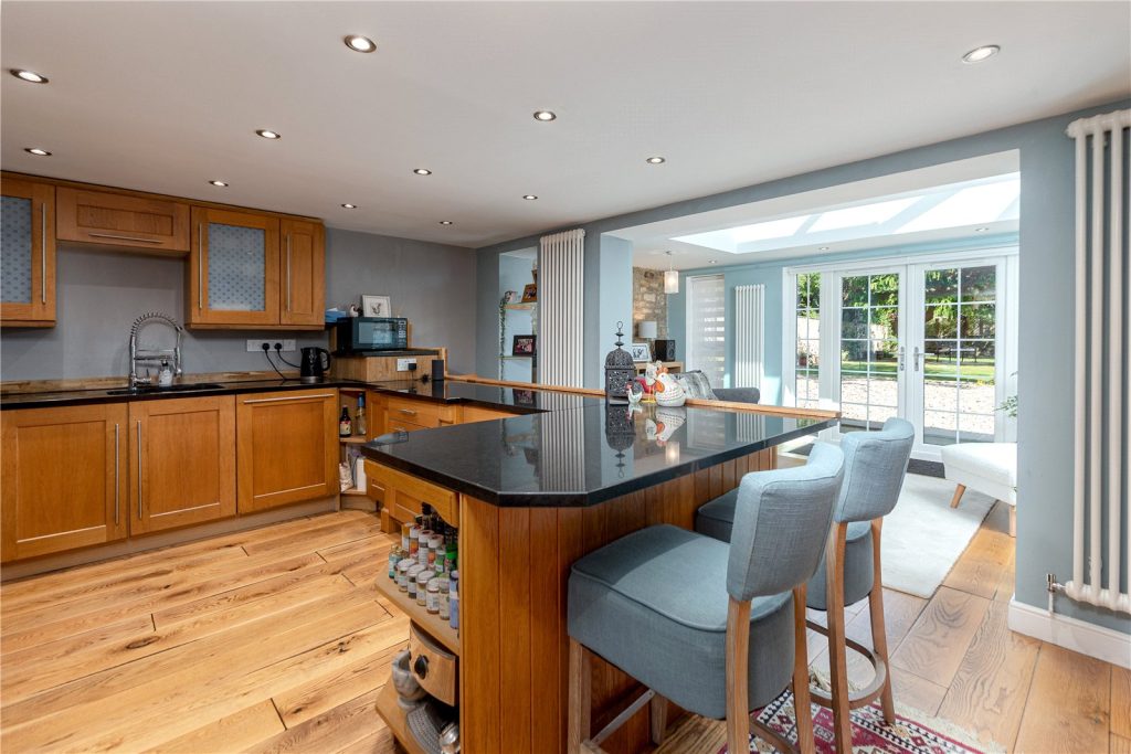 The accommodation then opens out further into the kitchen area which is fitted with Oak units with a granite worktop over. There is an inset stainless steel sink, integrated dishwasher and an electric range with induction hob and Neff extractor above. There is an extended breakfast bar with additional shelving and space for an American style fridge freezer. The engineered Oak flooring continues to run through the kitchen area and into the garden room.