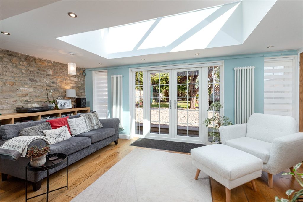 The garden room has windows and French doors opening into the rear garden and a pitched, glazed lantern roof. It provides a lovely aspect over the private garden to the rear.