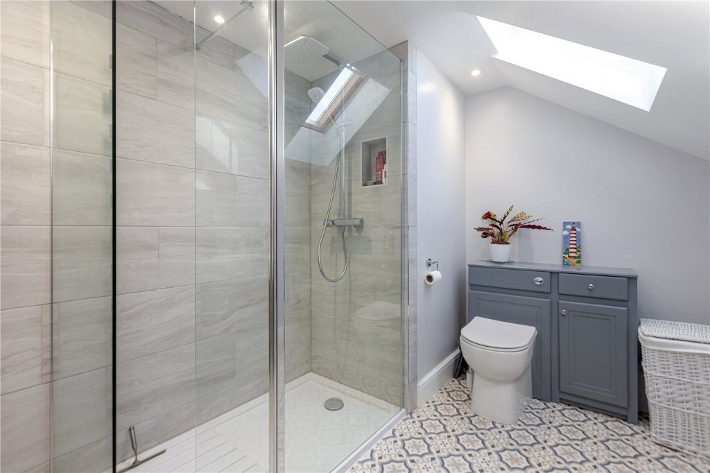 Stairs rise from the reception area to the first floor landing. There are four good sized bedrooms. The master bedroom is at the rear of the property, it has a window overlooking the rear garden, two large fitted wardrobes and a recently updated en-suite shower room. There is a large walk-in shower cubicle, WC and wash hand basin set into vanity cupboards, two Velux windows and a chrome heated towel rail.