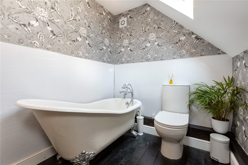 The house bathroom is fitted with a white modern suite which comprises of a free standing ball and claw bath, WC and wash hand basin, Velux window and chrome heated towel rail.