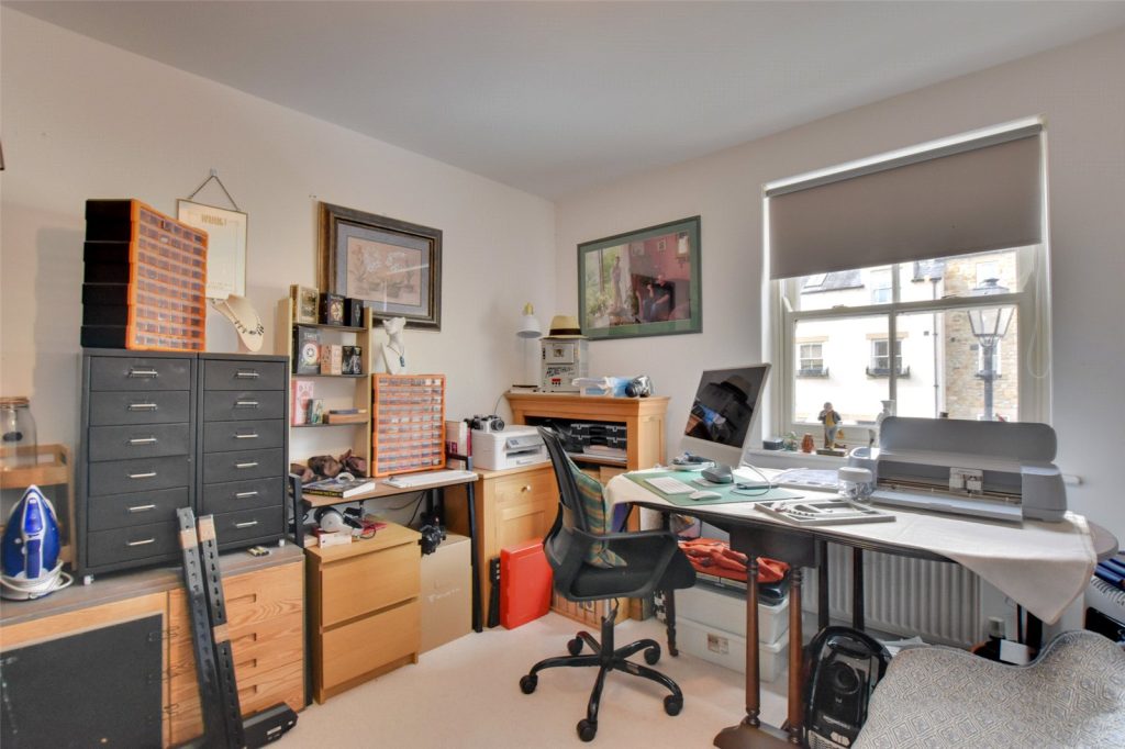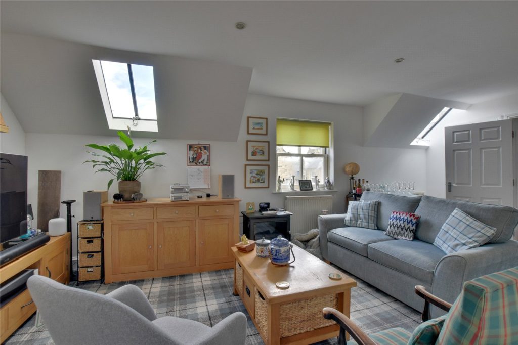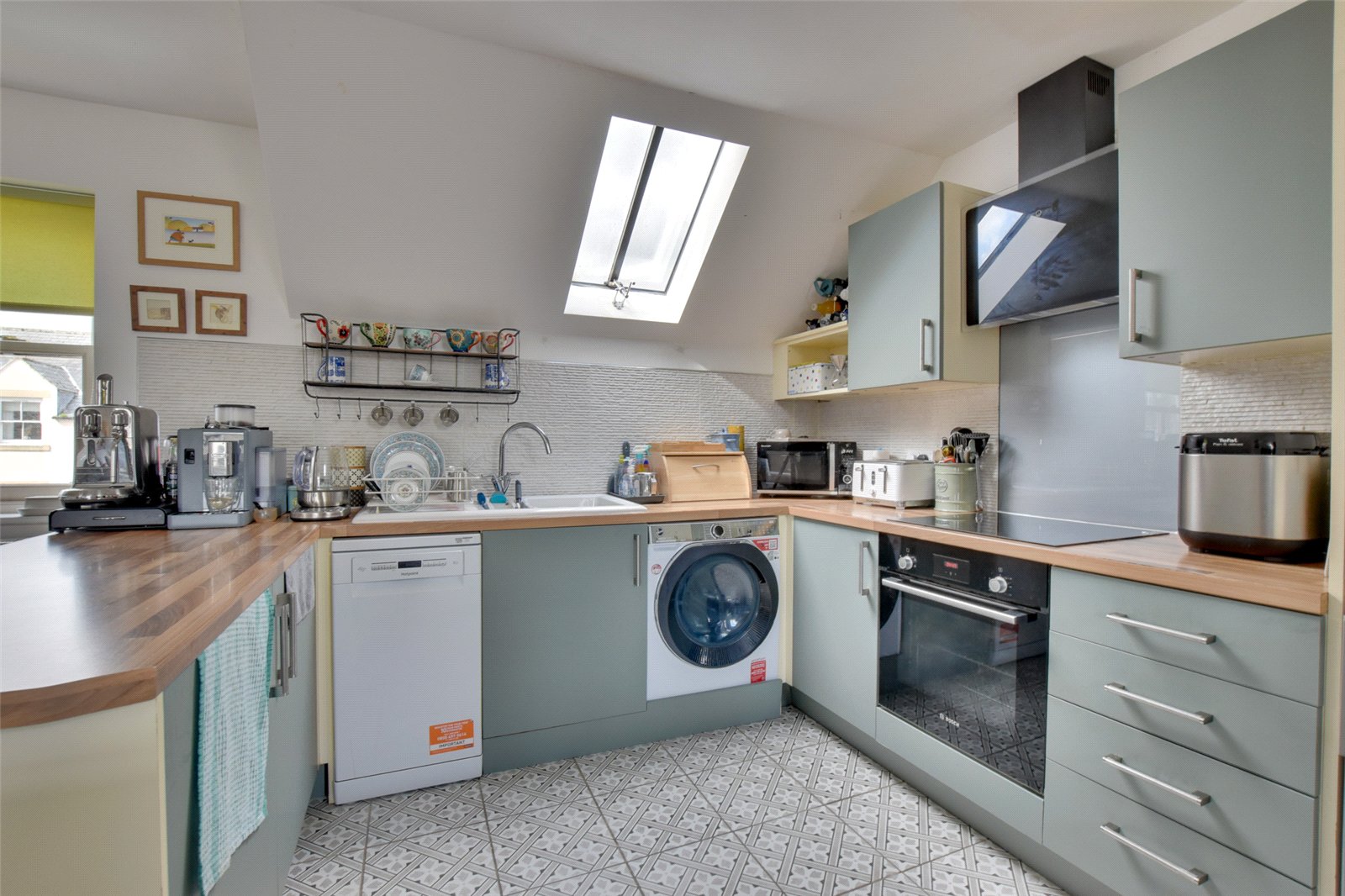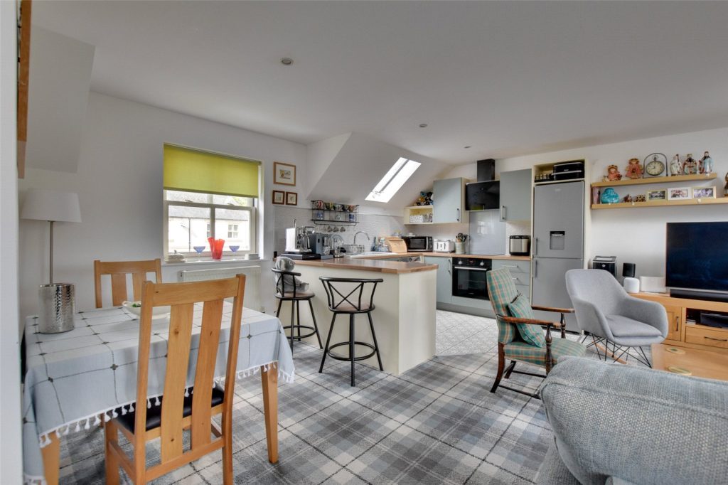 A further staircase leads from the landing to the second floor, which accommodates the remaining living space. The open plan living room, dining room and kitchen enjoy a dual aspect to both the front and rear. The living area offers ample space for a sofa and coffee table, while the dining area comfortably accommodates a small table and chairs. The open plan layout provides flexibility in how the space can be arranged.