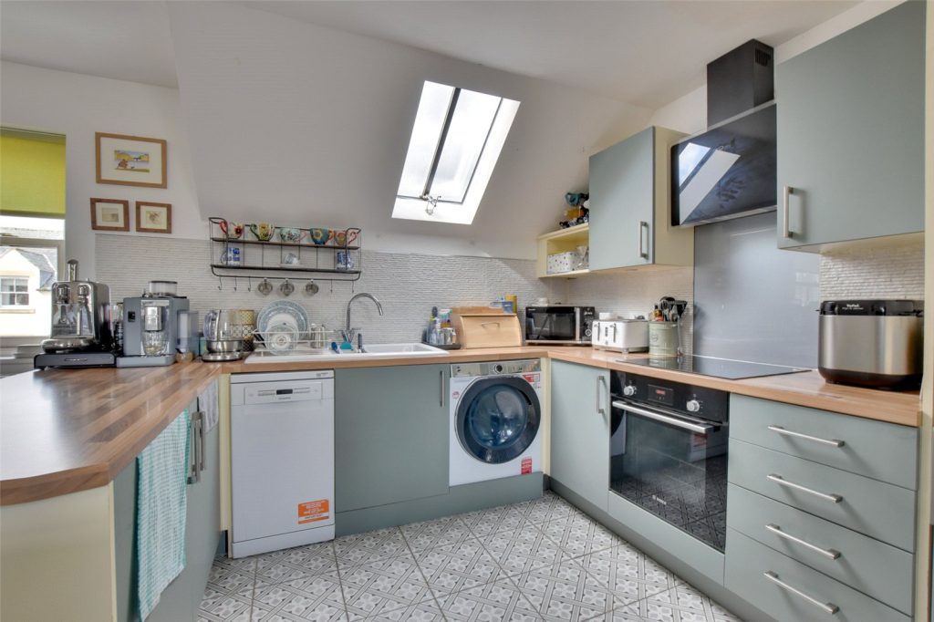 The kitchen area is well lit by skylights set into the ceiling and features a modern patterned tiled floor. It is fitted with contemporary high gloss wall and base units topped with wood effect work surfaces. There is a built in electric oven and hob with an extractor fan above, along with space and plumbing for a washing machine and a slimline dishwasher.