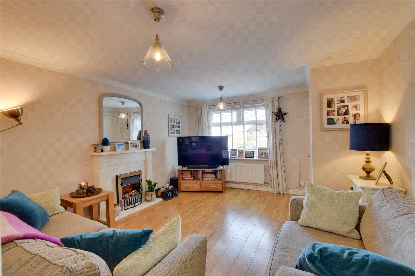 The main entrance leads into the reception hallway, where to the right hand side lies the living room. Featuring oak effect laminate flooring, the focal point to the room is the gas flame effect fireplace with a wooden surround.