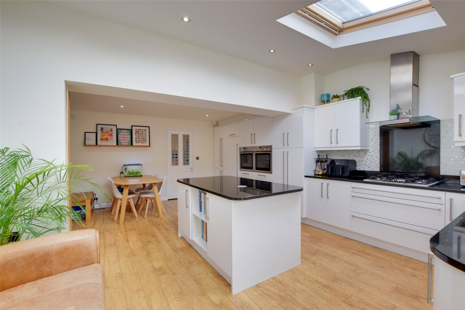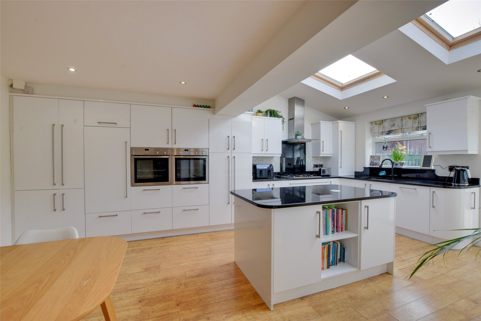 The impressive kitchen/diner lies to the rear, and is fitted with an extensive range of base and wall mounted storage units, topped with granite worktops which incorporate a stainless steel sink. Integral appliances include two eye level ovens, a five ring gas hob with an extractor fan over, a dishwasher and a larder style fridge. A central island provides further workspace and storage, while there is ample space for a dining table. The room is flooded with natural light courtesy of the Velux skylights, and French doors leading out to the rear garden.