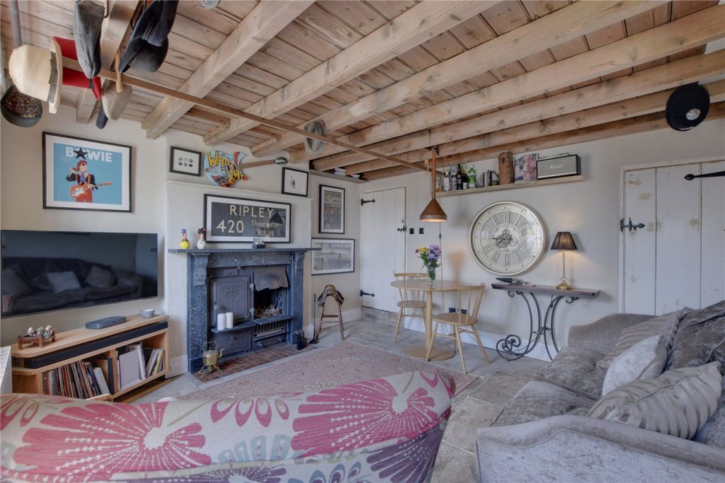 The main entrance leads into the living room, which features flagged stone flooring and traditional beams to the ceiling. The focal point is the impressive original cast iron range.