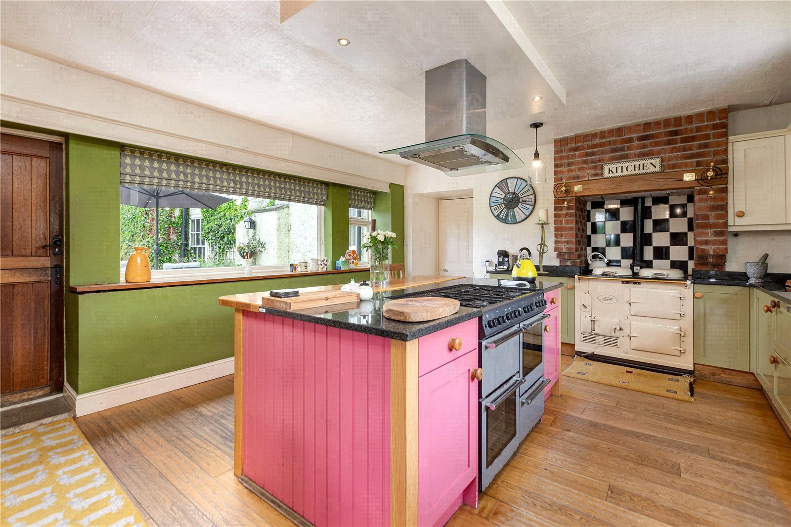From here there is the impressive country style kitchen, which extends into an informal dining area. Fitted with a good range of wooden wall and base units, which are topped with contrasting granite working surfaces, with upstep splash back. The worktops incorporate a double French Butlers sink which has a pleasant front view aspect. There is also a traditional cream aga which is recessed into an inglenook with exposed brick chimney breast and tiled splash back. A central island unit houses a conventional range style oven with a gas hob, having an extractor overhead. The island unit is also topped with granite working surface and offers extra space for cooking.