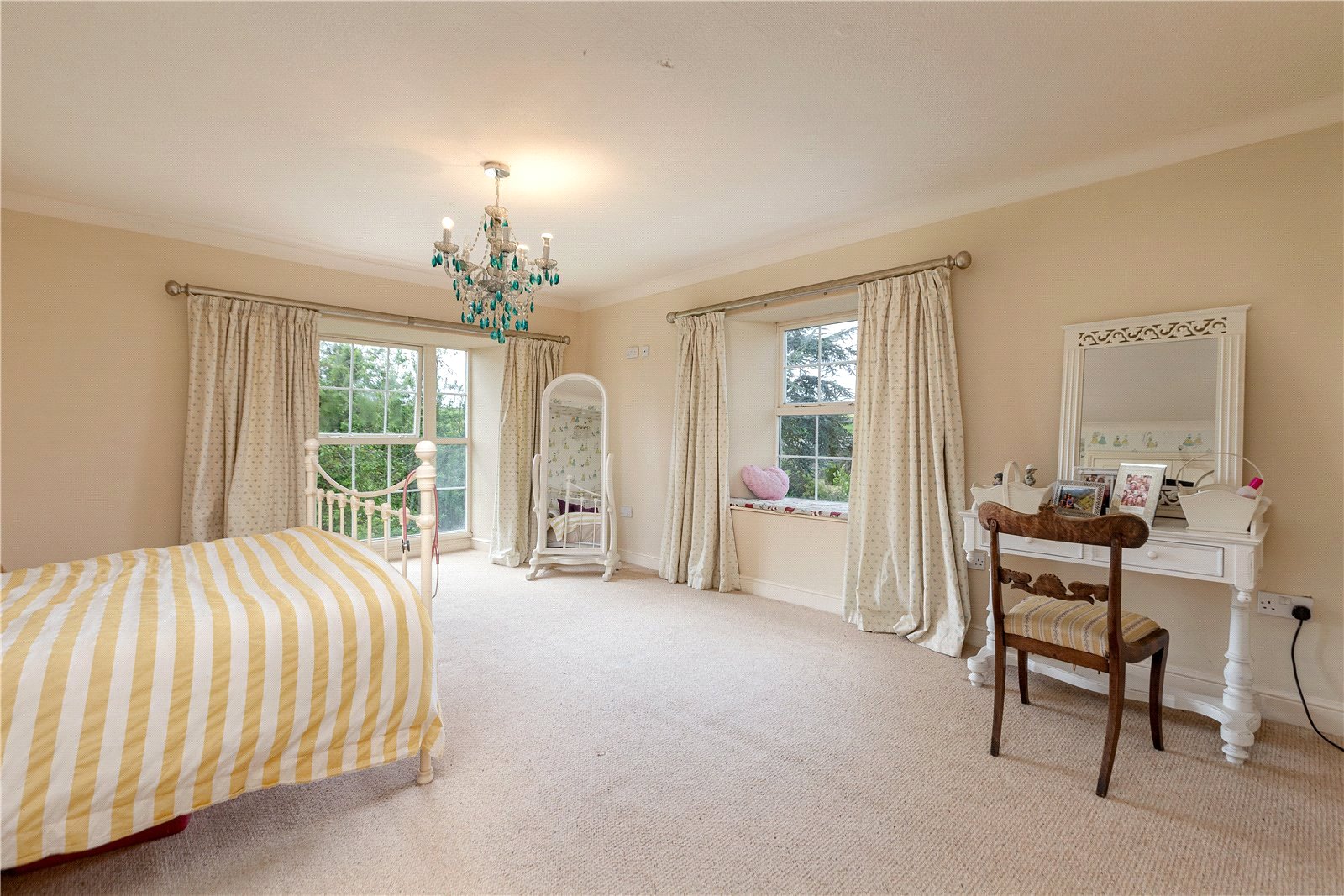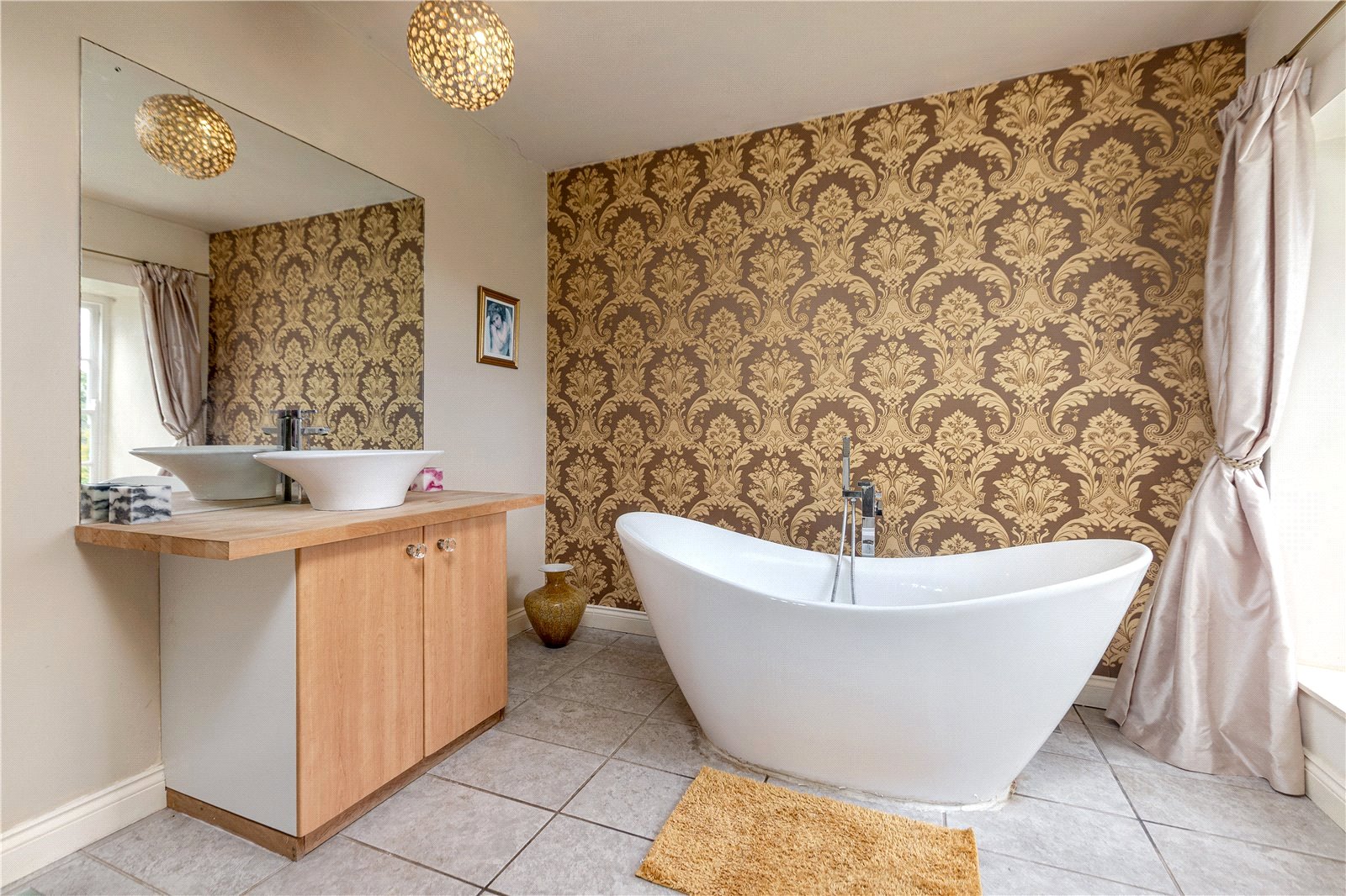 To the first floor of the main house, there are four double bedrooms, all of which feature en-suite facilities and a variety of built in storage and storage cupboards. The main bedroom, however, offers a full suite, with double doors leading to a full, en-suite bathroom, with a freestanding bath, wash hand basin set upon a vanity and low level WC. The floor is tiled, while a plain glass window enjoys views over the garden. The main bedroom also boasts a walk in wardrobe.