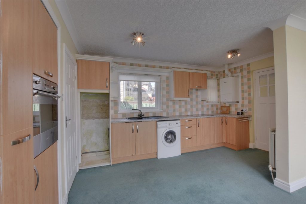 The kitchen/diner is situated to the rear, and is fitted with a range of wall and base mounted storage units topped with contrasting worktops which incorporate a composite sink. Integral appliances include an electric four ring hob with an extractor fan over, as well as an eye level oven, while there is space, power and plumbing for further freestanding appliances.